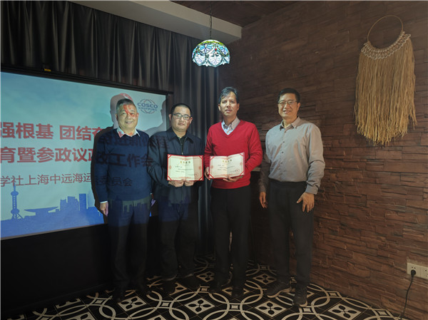 随后,委员刘诗瀚通报了委员会2023年参政议政工作情况及2024年工作计划,并组织对2023年度参政议政先进个人进行表彰。林智威、顾问任照平为获得2023年度九三学社上海中远海运委员会参政议政先进个人荣誉称号的王晓宇、叶勇两位社员颁发荣誉证书并合影留念。