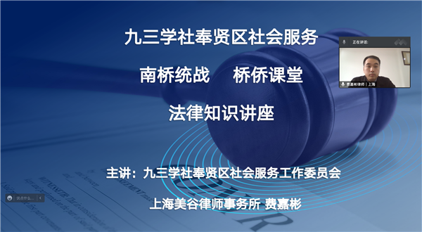 3月24日,九三学社奉贤区委社会服务工作委员会与奉贤区南桥镇侨联联合开展了“侨界法治宣传月”专题普法线上讲座。
