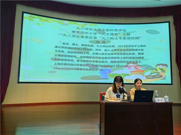 10月27日下午,由九三学社上海市委、九三学社奉贤区委与奉贤区教育局联合开展的“九三院士专家进校园”暨“九三学社上海市委科普讲坛”讲座活动再次开讲。本次讲座邀请社员、上海市农业科学院生态所助理研究员张月,走进奉贤区青溪中学,为全体六年级学生作题为《蚯蚓·生态农业指示灯、农民致富金钥匙》长江生态环境保护专题讲座,青村校区学生同步线上直播观看。