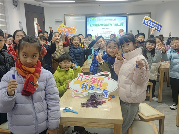 3月14日下午,社市委科普工作委员会副主任郑慧琼课题组成员、助理研究员谢俊燕在万航渡路小学为孩子们带来了一节题为《五彩缤纷大自然的“魔法师”》实验课程。谢老师首先从各类植物的色彩入手,引出了叶绿素、花青素和类胡萝卜素等植物界常见的色素及其特点、作用,并着重讲解了花青素在不同酸碱条件下呈现的不同色彩及原理。随后,在谢俊燕老师和志愿者们的指导下,同学们通过实验提取出紫甘蓝汁液,再添加不同的试剂,并仔细观察紫甘蓝汁液的颜色变化。看到紫色的提取液在滴入白醋后逐渐变为粉红色,而加入小苏打溶液后,则慢慢变成了蓝色,这一神奇的变化让学生们兴致盎然,激动万分。