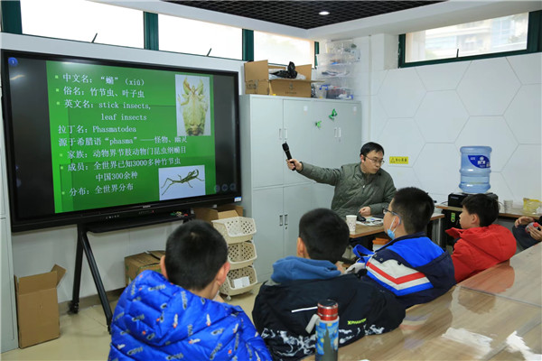 交还竹节虫后,同学们坐下聆听上海昆虫博物馆科普部主任黄健波老师作《密林寻踪——竹节虫》专题报告,了解竹节虫的一生变化、生存环境、自我保护以及相关趣闻。