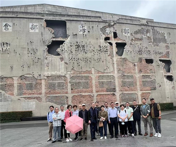 社员们怀着无比崇敬的心情参观了上海四行仓库抗战纪念馆。展览分为“血鏖淞沪”“坚守四行”和“孤军抗争”三大板块。通过一幅幅历史照片、一件件烈士遗物、一个个杀敌场景、一段段历史影像,生动还原了四行仓库“八佰壮士”奋勇杀敌、保家卫国的家国情怀和大义凛然、不怕牺牲的抗争精神。西墙壁上触目惊心的弹孔,满目疮痍的痕迹活生生地镌刻着壮士惨烈而悲壮的战斗场面,也深深地刺进我们每个人的心灵。漫步于纪念馆长廊,仿佛听到了战争的号角再次响起,殷红的战场再次浮入眼帘,谢晋元将军正慷慨激昂做着战斗动员,八佰壮士正奋勇向前与敌人浴血奋战,革命先烈正怀抱手榴弹跳下大楼与日本侵略者同归于尽。离开时天空也开始飘起细雨,仿佛在告慰着四行仓库的烈士英灵,缅怀着“八佰壮士”。