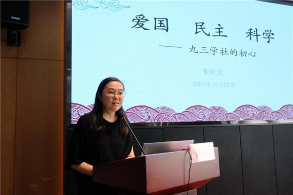 在10月27日开展的专题学习活动中,社上海市委宣传部副部长曹晓燕作了题为《爱国 民主 科学——九三学社的初心》的专题报告。回顾了九三学社的缘起、发展历程、“爱国、民主、科学”的优良传统,讲述了新时代多党合作的职能定位以及新发展阶段的新特征新要求。