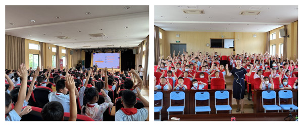 王大红以《音乐与健康——音乐让生活更美好》为主题,用一曲曲优美的音乐带领杨园中心小学1000余名师生走进艺术的世界。从同学们喜闻乐见的《黑猫警长》《少年英雄小哪咤》到钢琴曲《命运交响曲》《秋日的私语》,再到悠扬的古筝曲《茉莉花》,她带领着同学们一起聆听,一起拍手歌唱,一起感受音乐的魅力。从科学家钱学森、苹果公司创始人乔布斯、音乐制作人李健和音乐之间的故事到曹鹏先生的“天使之音”项目,她用一个个生动的故事告诉同学们,好的音乐可以启迪人、引领人、关爱人,可以帮助我们拓展综合视野、提高审美水平、培养多元能力。最后,讲座在全体同学高声合唱《我和我的祖国》的歌声中结束。