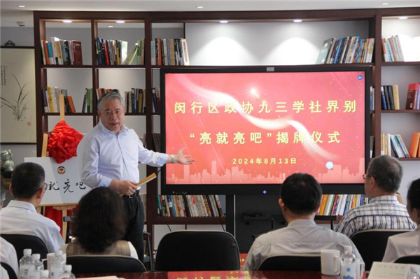 8月13日下午,闵行区政协九三学社界别“亮就亮吧”揭牌仪式在社区委“社员之家”隆重举行。闵行区政协主席祝学军,九三学社上海市委专职副主委詹咏,闵行区政协秘书长韩朝阳,区政协常委、九三学社闵行区委主委龚明红,上海市作家协会原副主席、党组书记、著名作家孙颙等出席活动。区政协机关相关领导及九三学社界别区政协委员等20余人参加活动。本次活动由社市委文化专委会主任、SMG融媒体中心主持人刘凝主持。