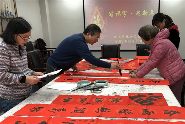 庚子新春来临之际,又到了一年一度写福、贴福、纳福的时候。春联和福字寓意美好一年的开始,为营造浓郁的节日气氛,同时也为正在举办的九三学社徐汇区委“时代风采——讴歌中华人民共和国成立70周年”书画摄影展完美收官,12月31日上午,社区委邀请社员、著名书画家杨维昌在徐家汇社区文化活动中心二楼芳草园开展新春送福活动。徐汇区人大专职常委、侨民宗工委副主任、社区委专职副主委兼秘书长周梅婴及近20位社员参加了活动。