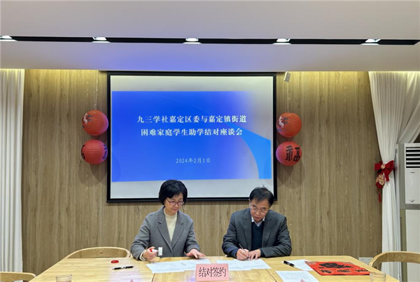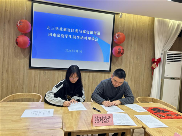 2月1日,九三学社嘉定区委与嘉定镇街道召开助学结对座谈会,并与困难家庭学生签署“爱心助学”协议。九三学社嘉定区委主委谢东升,嘉定镇街道党工委委员、办事处副主任冯晴,社区委副主委孙武,社区委安亭支社社员周宇和结对家庭等参加座谈签约。