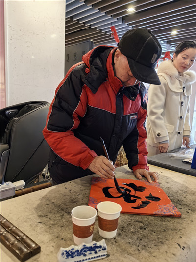 活动邀请社区委社员、书法家姚家齐为社员们书写祝福。随着姚家齐现场挥毫,一幅幅形态各异的“福”“寿”呈现在大家眼前,各种字体尽显深厚功底,令社员们赞叹不已。在一片墨香中,大家认真挑选自己喜爱的作品,小心收起这份温暖的新春礼物,互道美好祝福,现场气氛温馨热闹。