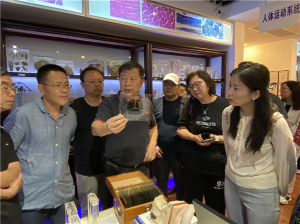 最后,社员们来到人体科学馆内,社市委学习和社史工作委员会副主任、社复旦大学委员会原副主委、上医分委员会原主委、复旦大学上海医学院基础医学院教授周国民动情地讲述了“大体老师”的故事,当得知遗体捐赠者中有多位上医教授及他们的家人,大家大受震撼,对他们生而为师、生命逝去后亦毅然选择为师的精神油然而生一股崇敬之情。