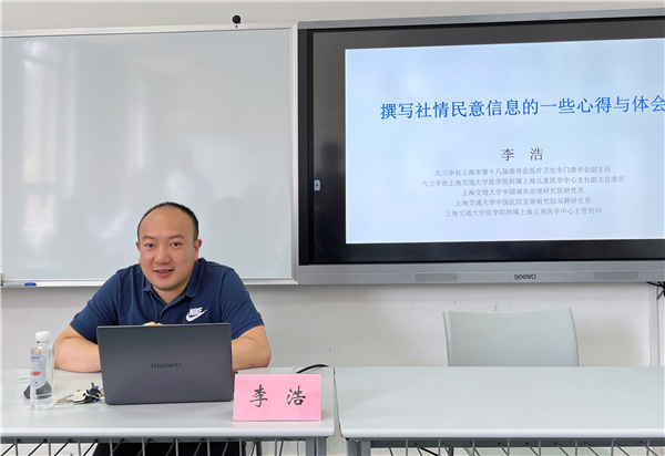 由于本次学习班参加范围多为近年加入的新社员,为提高大家对参政议政工作的认识,学习班还邀请九三学社上海市委医疗卫生专门委员会副主任、上海交通大学医学院附属上海儿童医学中心临床研究管理中心药师李浩分享他撰写社情民意信息的心得与体会,通过他本人的一些事例,让大家了解如何立足于本职工作,充分运用好个人专业资源,写出一篇高质量的社情民意信息。