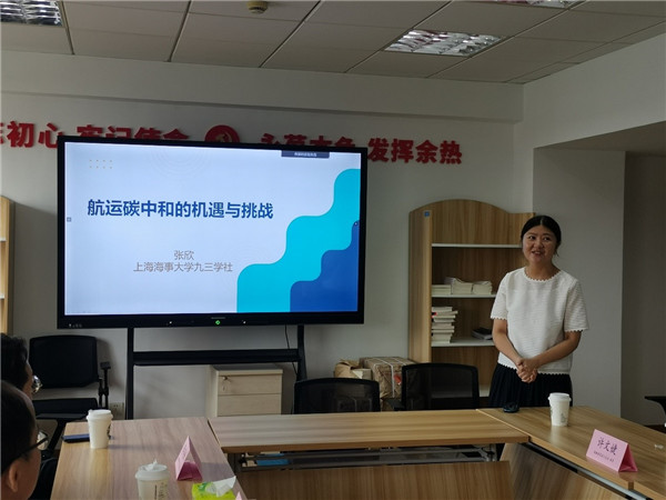 上海海事大学委员会第二支社主委、上海海事大学交通运输学院教授张欣带来题为《航运碳中和的机遇与挑战》的专题报告,介绍了航运碳排放与脱碳现状。她在航运碳中和这个前沿领域造诣深厚,深入浅出、娓娓道来,带领大家从航运碳中和的挑战中找寻和发现机遇。