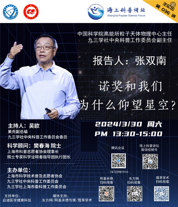本周六,九三学社中央科普工作委员会副主任、中国科学院高能所粒子天体物理中心主任、中国科学院大学教授张双南将带来专题报告《诺奖和我们为什么仰望星空?》,讲述诺奖和天文学背后有趣的科学故事、深刻的科学方法以及科学对人类文明的意义。