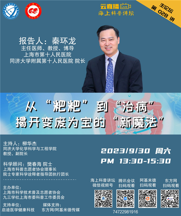 本周六,同济大学附属第十人民医院、上海市第十人民医院院长秦环龙将带来《从“粑粑”到“治病”,揭开变废为宝的“新魔法”》,为您介绍肠菌移植的意义和展望。