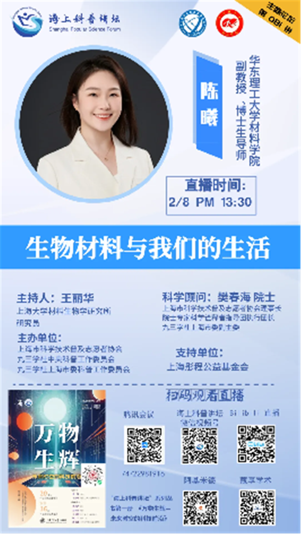 华东理工大学材料学院副教授、博士生导师陈曦长期从事材料生物学基础研究,先后主持国家自然科学基金面上项目和青年项目、科技部重点研发项目子课题等。本周六,她将带来专题讲座《生物材料与我们的生活》,为大家介绍生物材料在现代医学中的应用。
