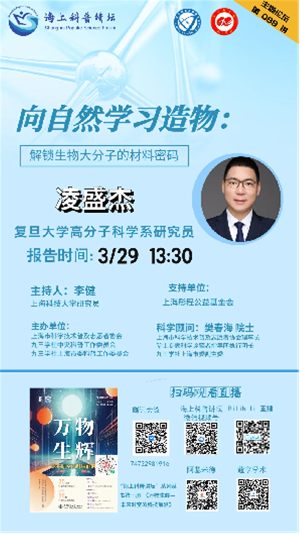 本周六,九三学社社员、复旦大学高分子科学系研究员凌盛杰将带来专题讲座《向自然学习造物:解锁生物大分子的材料密码》,剖析生物材料跨尺度结构与性能之间的关联机制,并借鉴天然材料的结构设计原理,探索仿生材料与活体系统的可控构建方法。