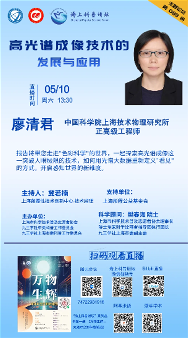 本周六,中国科学院上海技术物理研究所正高级工程师廖清君将带来专题讲座《高光谱成像技术的发展与应用》,带您走进这个“色彩科学”的世界,一起来探究这项突破人眼极限的技术,开启感知世界的新维度。