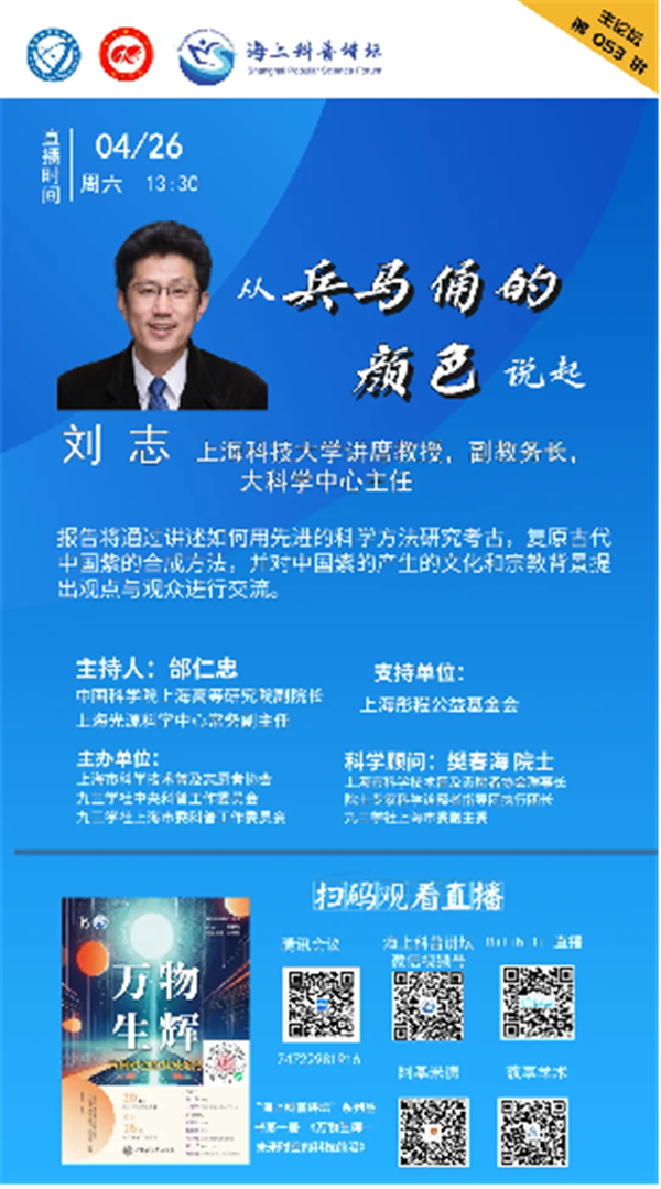 本周六,一起来听上海科技大学讲席教授、副教务长,大科学中心主任刘志带来专题讲座《从兵马俑的颜色说起》。