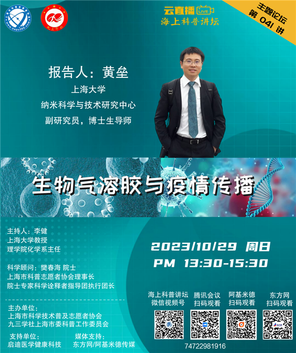 本周日,上海大学纳米科学与技术研究中心副研究员、博士生导师黄垒将带来《生物气溶胶与疫情传播》,为大家详解生物气溶胶与病毒传播的关系。