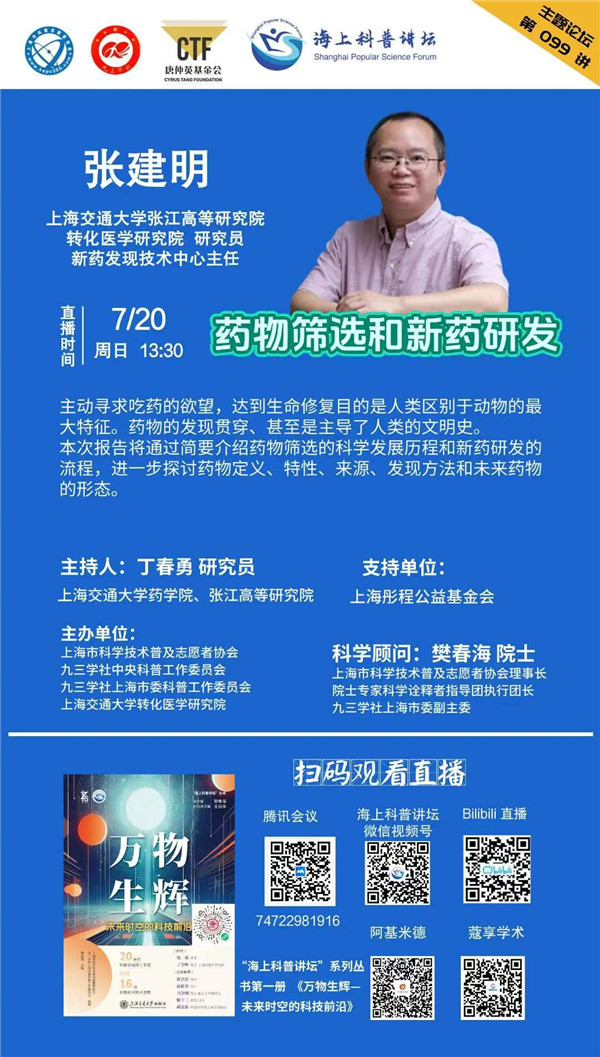 本周日,讲坛邀请上海交通大学张江高等研究院和转化医学研究院研究员、新药发现技术中心主任张建明带来讲座《药物筛选和新药研发》,将简要介绍药物筛选的科学发展历程和新药研发的流程,并探讨药物定义、特性、来源、发现方法和未来药物的形态。