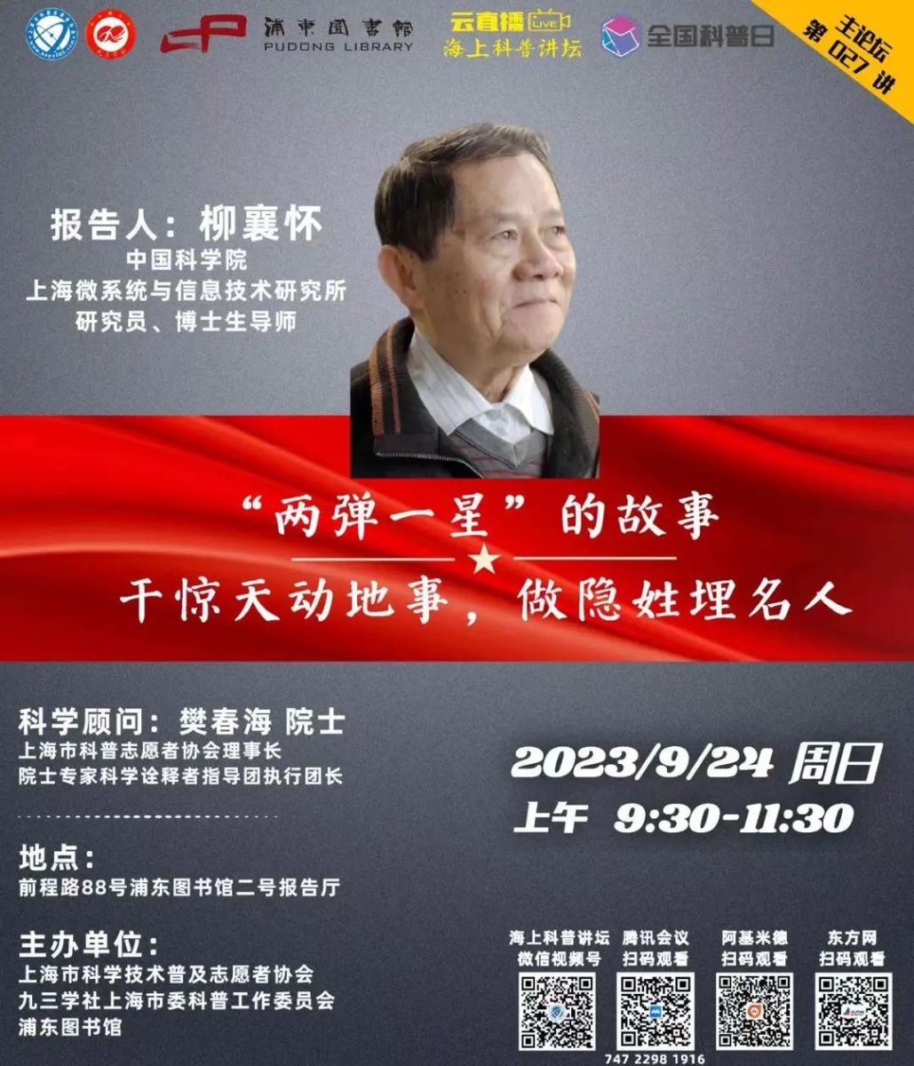 本周日,九三学社社员,中国科学院上海微系统与信息技术研究所研究员、博士生导师柳襄怀将带来《“两弹一星”的故事——干惊天动地事,做隐姓埋名人》,从自己的亲身经历出发,为大家分享他为两弹一星“蘑菇云”早日升空而奋斗的历程,以及从事离子束材料表面处理研究和应用的日日夜夜。