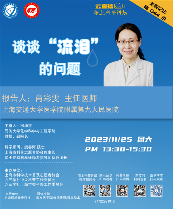 本周六,九三学社中央科普工作委员会副主任、社上海市委老年工作委员会副主任,上海交通大学医学院附属第九人民医院眼科主任医师肖彩雯将带来《谈谈“流泪”的问题》,带领大家一起了解泪道堵塞与泪道内镜。