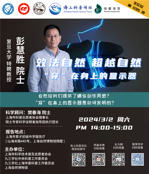 本周六,中国科学院院士、复旦大学特聘教授彭慧胜将带来专题报告——《效法自然 超越自然 “穿”在身上的显示器》,带领大家一起了解智能纤维器件。