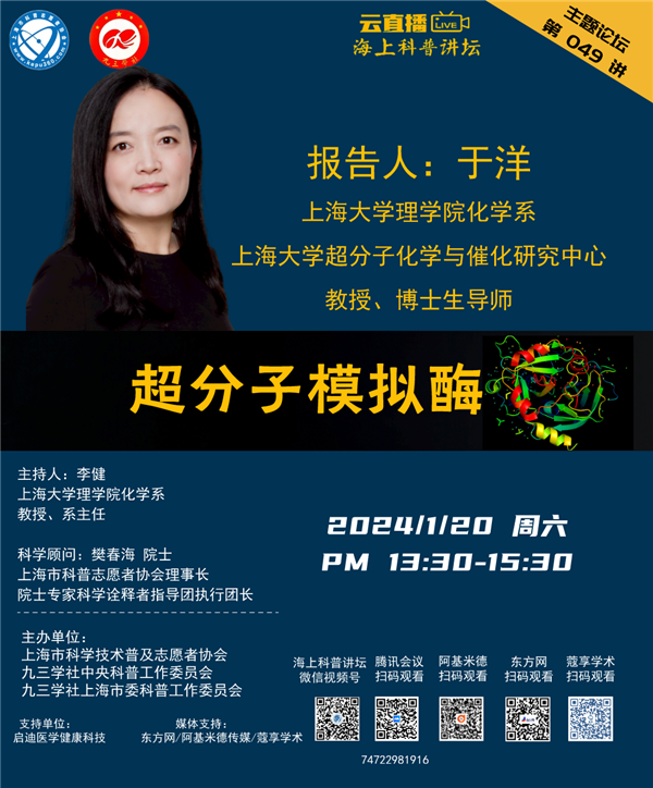 本周六,上海大学理学院化学系和上海大学超分子化学与催化研究中心教授、博士生导师于洋将带来《超分子模拟酶》,跟大家一起探讨超分子模拟酶的产生、发展及催化历程。
