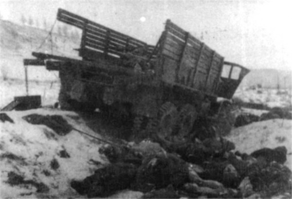 看洞外,太阳露头,皑皑白雪上一片红光。我和徐背上着装,反穿上衣(我的着装是一条薄被,两身单衣,一双备用鞋,一只相机,十数个胶卷,一只水壶,干粮已吃尽,要找到部队才有)。走出山沟,向山间公路走去。敌机两架一批、四架一批地在山间公路上空轮番盘旋扫射(二次战役时的敌机因我们不能打,飞得很低,极端猖狂),但我俩顾不了这许多,即使“头皮发麻”,也得冒死前行,因为要在白天采访完绵延四十余里的战场后,再在傍晚前赶到下碣隅里机场附近的76师部队(天黑后,他们可能会向前转移)。所以我们只能边隐蔽边前进,只有在敌机俯冲扫射投弹时,才趴在雪窝里防空。公路上一片黑一片白的,白的是雪,黑的是焦土,空气里充满着汽油味和火药味,这是前夜激战的痕迹。有四、五里路长的一段路面,到处都是美军残破的军用十轮大卡、小吉普和翻倒的坦克,死尸成堆地散落在卡车旁、坦克上,有一辆冲下山坡半翻在山沟里的十轮大卡上,一个蓬头的美军司机半伏在驾驶盘上,一只脚跨在车门外僵死了。还有从坦克车顶盖上爬出了半个身子时被击中后而冻僵了的坦克手死尸。