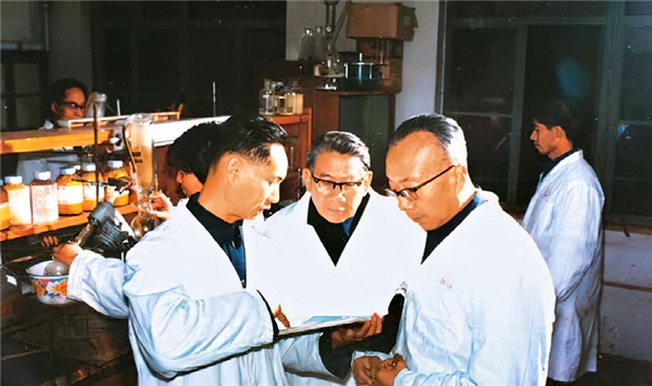 王应睐(中)、陈常庆(左)和同为九三学社社员的王德宝(右)在一起讨论酵母丙氨酸转移核糖核酸人工合成工作