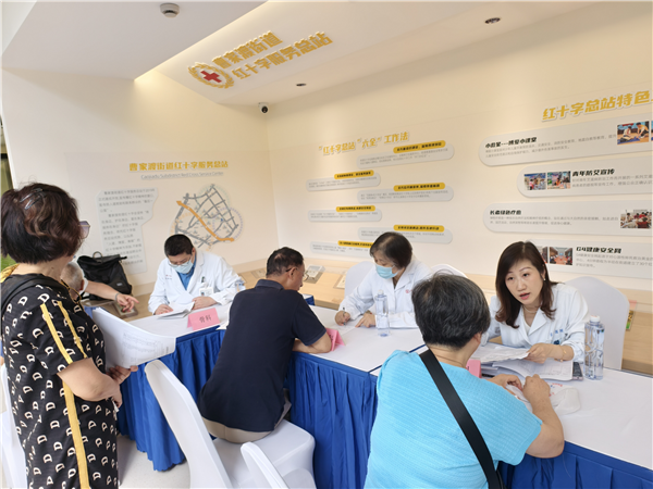仪式后,九三学社健康咨询基地开展挂牌后的首次活动,12位社内外医疗专家为社区居民们提供了中医科、骨科、心内科等9个科室的健康咨询和测血压、量血糖等健康便民服务。