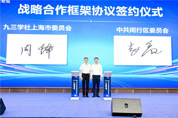 九三学社上海市委专职副主委周锋和中共闵行区委常委、副区长赵亮分别代表九三学社上海市委和中共闵行区委签约了战略合作框架协议。