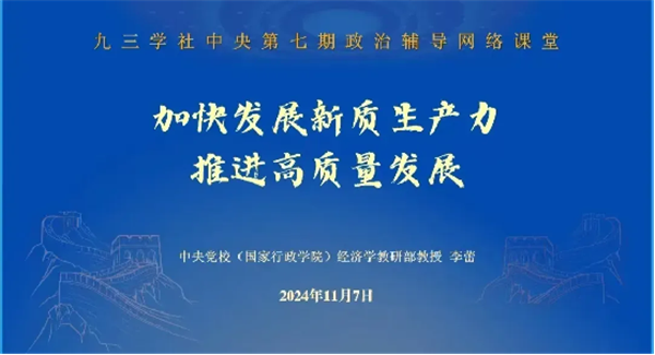 11月7日下午,九三学社中央宣传部在社中央机关举办社中央第七期政治辅导“网络课堂”。本期课堂以线上线下相结合的方式进行,由中共中央党校(国家行政学院)经济学教研部教授李蕾作题为《加快发展新质生产力 推进高质量发展》的辅导报告。