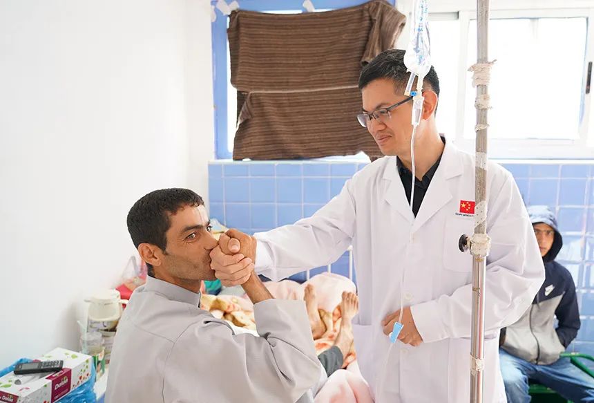 吻手礼在摩洛哥是很高的礼节,这是沈东杰治疗的一位胃穿孔病人,病人康复后,非常感激中国大夫尽心尽力的治疗和帮助。