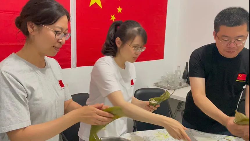 图为于阅尽(左一)和队友们在端午节一起裹粽子。于阅尽所在的塔扎医疗分队在塔扎依本姆-巴加省立中心医院工作。身为队长,她要应对队里发生的各种事情,大到和当地卫生厅、受援医院之间的医疗事务沟通、组织义诊、团建等活动,小到医疗队驻地卫生、买菜买水,都要一一安排妥当。逢年过节,她不忘组织队员们一起动手,包饺子、做汤圆、裹粽子……让餐桌上更有家乡的味道。