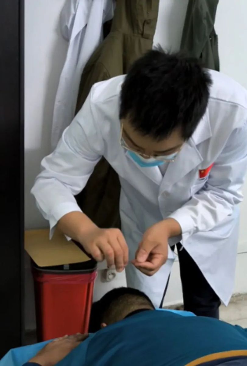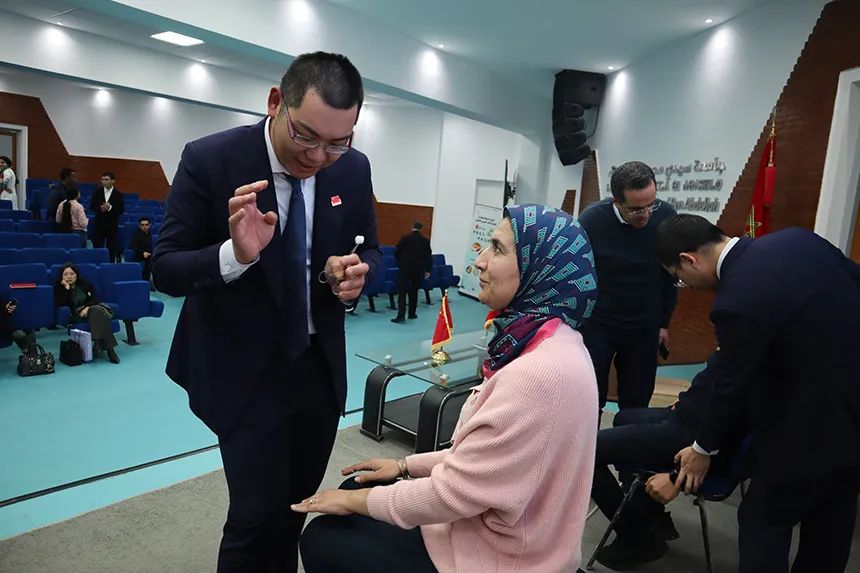 中医讲座后的体验环节,最能引发当地师生们对中医的热情,在体验过中医四诊、针灸穴位、推拿手法的操作后,教师和学生无不啧啧称奇,沈含冰也会一一耐心解答师生们提出的问题。图为沈含冰正在为当地患者施针。