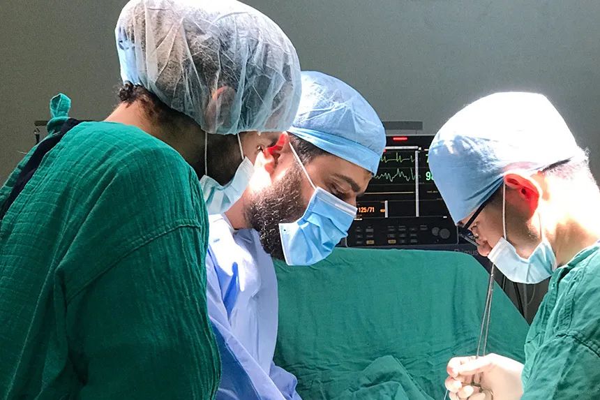 2019年2月22日,九三学社社员、瑞金医院卢湾分院普外科副主任医师沈东杰带领黄浦区卫健委组建的中国援摩医疗队沙温分队来到了摩洛哥,开展为期两年的医疗援助工作。沙温地处山区,交通不便,缺医少药,医院里设施简陋,设备缺乏,连许多当地医生都不愿留在这里。虽然当地的医疗条件极其艰苦,但沈东杰和援摩队员们从未退缩。中国医生在这里成为主力,独立值班,独立诊疗,怀着热忱和大爱,为当地卫生事业的发展、为人类健康福祉贡献自己的青春与力量。图为赴摩后沈东杰(右一)与当地医生合作,参与的第一台手术。