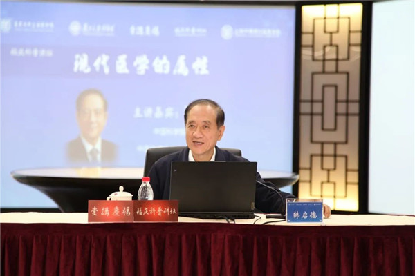 同日,韩启德应复旦大学图书馆医科馆邀请,在“福庆科普讲坛”作题为《现代医学的属性》的开年第一讲,这也是医科馆作为九三学社全国传统教育基地的一项特殊活动。袁正宏和复旦大学图书馆副馆长应峻主持会议,4100多位网友线上收看了讲座直播。