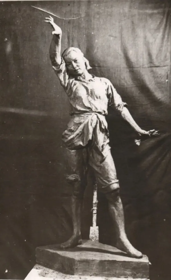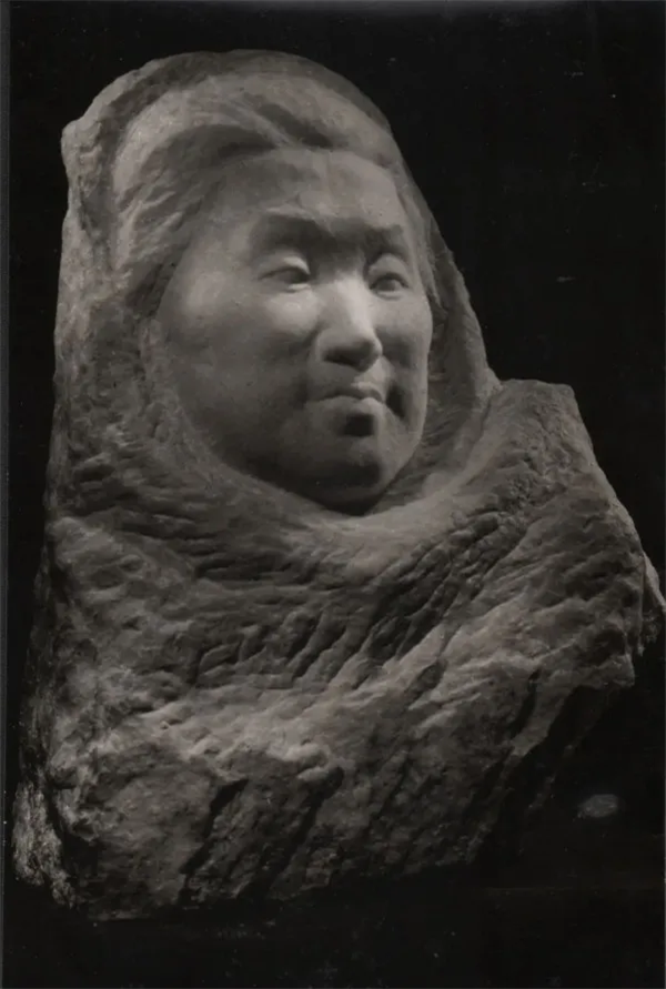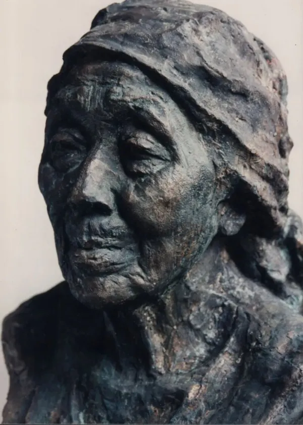 《母亲》的原型来自卢琪辉孩子的奶妈,一位勤劳朴实的江南农村妇女。“母亲”头裹毛巾,典型的江南农村老妇的装扮。老人双眉微皱,目光略下垂,面部松弛柔和,神色从容平静,缄默的双唇微闭,雕塑呈现一种慈爱温和的情绪。整体造型较为圆浑、温厚,敦实。丰富的塑痕自然生动,也恰如其分地体现了老人肌肤松弛的质感,暗示了老人饱经风霜的生活阅历。