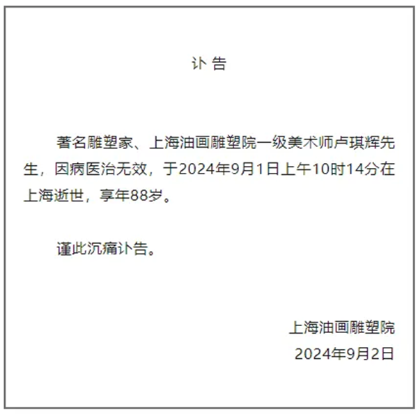 据“上海油画雕塑院”微信公众号9月2日消息,九三学社社员、著名雕塑家、上海油画雕塑院一级美术师卢琪辉先生,因病医治无效,于9月1日10时14分在上海逝世,享年88岁。