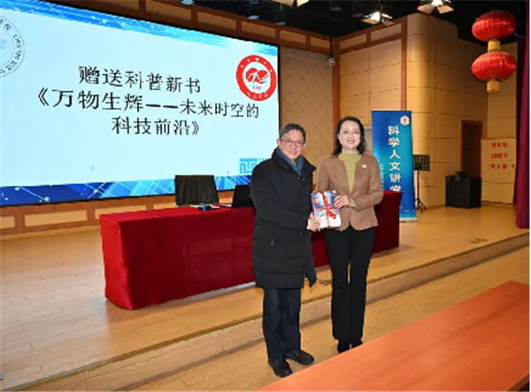 李国娟代表社市委向金卫东赠送科普新书《万物生辉——未来时空的科技前沿》。