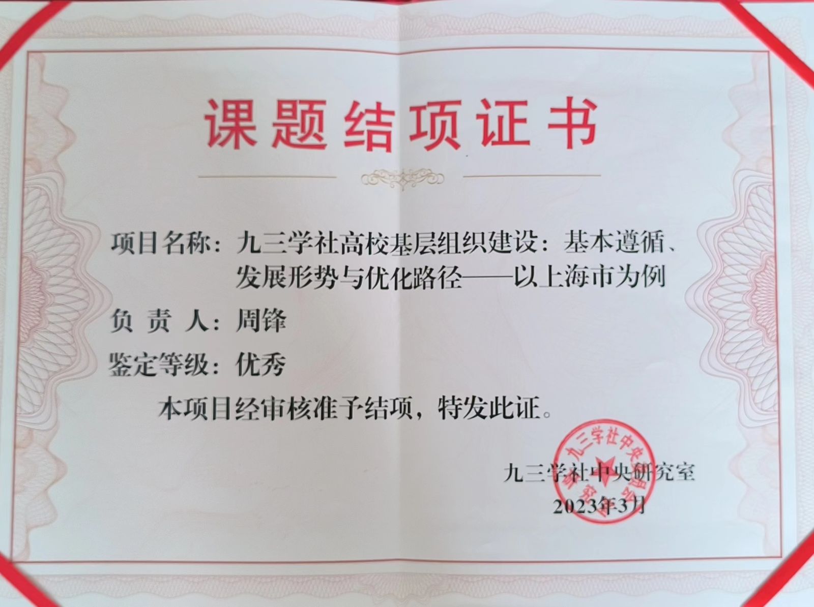 由社上海市委专职副主委周锋担任负责人、社市委学习和社史工作委员会副主任王晓灵执笔的课题《九三学社高校基层组织建设:基本遵循、发展形势与优化路径——以上海市为例》被鉴定为优秀课题。