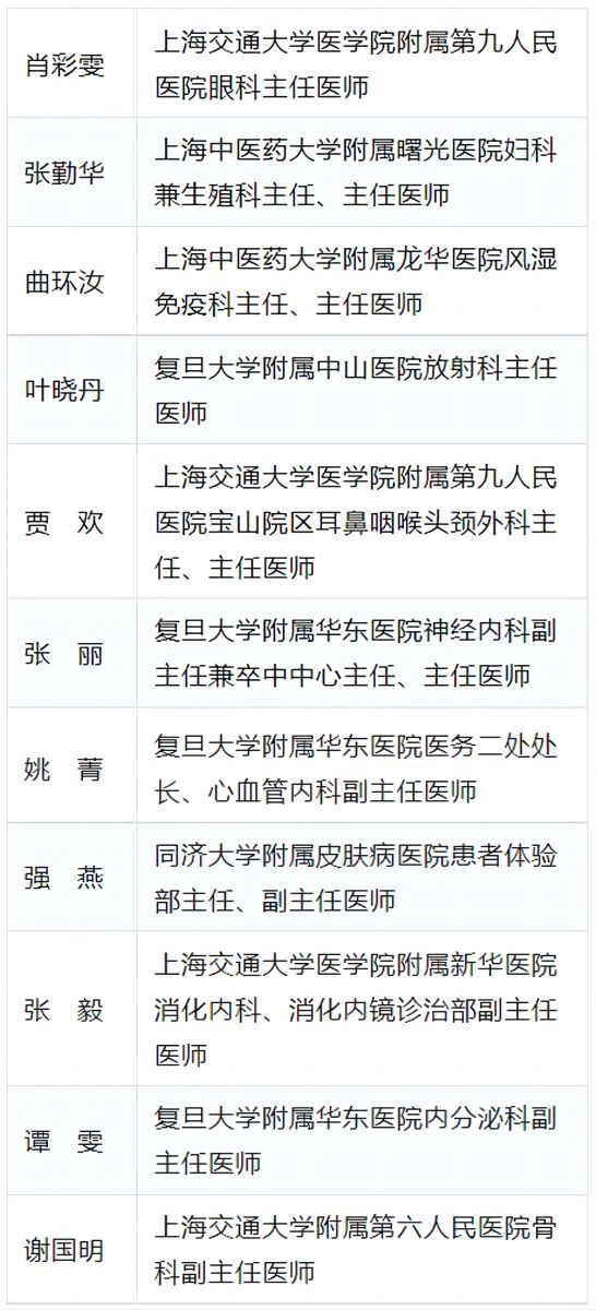此次活动,社市委医疗卫生专门委员会组织了上海交通大学医学院附属第九人民医院、新华医院,上海交通大学附属第六人民医院,复旦大学附属中山医院、华东医院,上海中医药大学附属龙华医院、曙光医院,同济大学附属皮肤病医院等众多上海市三甲医院的专家,涵盖眼科、消化科、妇科兼生殖科、风湿科、放射科、耳鼻喉科、心内科、骨科、内分泌科、神经内科、皮肤科等多个科室。