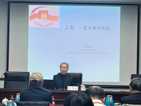 会议特邀上海市文史研究馆馆员、上海抗战与世界反法西斯战争研究会会长、上海师范大学教授苏智良作主题报告——《上海:一座名城的抗战》。他从上海作为抗日救亡运动的中心、抗战的重要战场、全民抗战的典范、国共再度合作基地以及世界反法西斯斗争的营垒等五个方面,讲述了上海人民众志成城、共御外辱的抗战历程,展示了天下兴亡、匹夫有责的爱国情怀,视死如归、宁死不屈的民族气节,不畏强暴、血战到底的英雄气概,百折不挠、坚韧不拔的必胜信念。