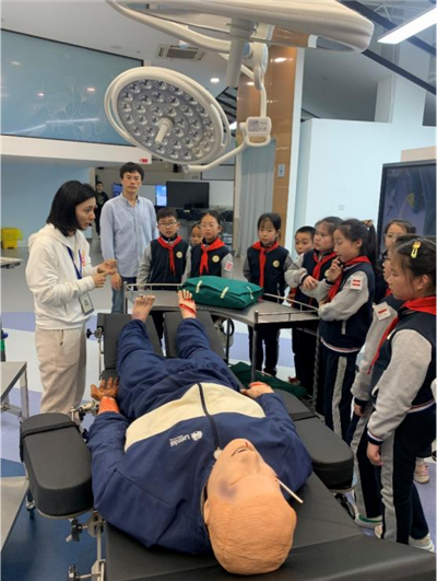 在医学实践教学中心,同学们在中心主任张浩和实验员的带领下认真参观,听取各大功能区介绍和相关医学科普知识讲解。同学们对在电影、电视里才能见到的无影灯、模拟人很好奇,脸上写满了惊喜,心中也种下了探索未来的种子。