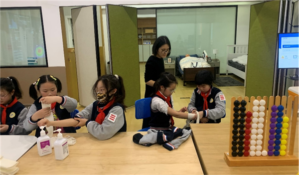 社员张雨萍和教学中心的老师们耐心地演示急救包扎的步骤,讲解急救知识,并指导同学们实践操作。同学们纷纷表示,通过这次学习,不仅学会了简单的急救包扎技能,还体会到了帮助他人、合作分享的快乐。