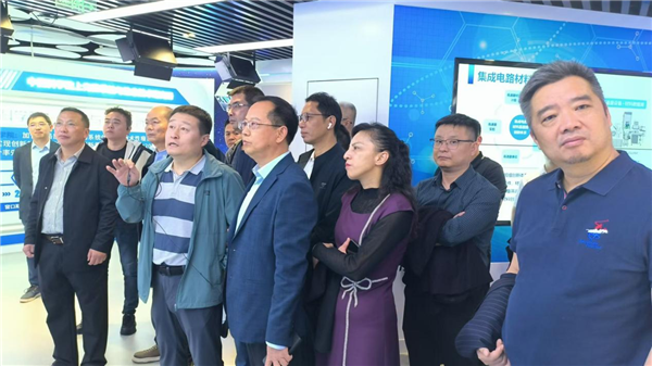 与会人员参观了研究所展厅,于广辉和社员牟刚、薛忠营向大家介绍微系统所发展历史、科创成果以及目前的研究部署情况。