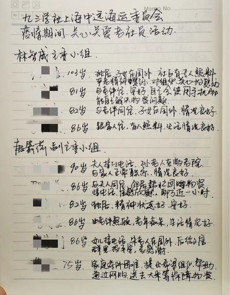 林智威等委员会班子成员及各支社委员还组成临时小组,通过电话、网络等方式慰问了社内75岁以上的老年社员10余人,了解他们的生活状况,并送去关心和慰问。林智威与103岁高龄的老年社员严忠铻直接联系,当电话中得知独居的严忠铻老先生所在社区安排专人送饭和物资,正常生活需求无忧后深感欣慰。送上关心的同时,也希望老先生有需要可以联系他。当了解到有老年社员生活状况困难时,唐箭荷第二天一大早网购好大米等物资,通过物流直送到社员家中。这不仅仅是解决温饱的及时雨,更是疫情中组织的温暖和社员的互助。