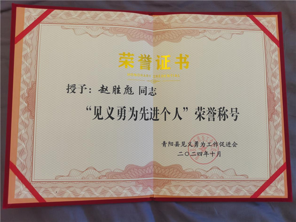 赵胜彪夫妇的英勇行为引起了社会的广泛关注。10月31日,安徽省池州市青阳县见义勇为基金会专程前往南京市雨花医院举行表彰大会,授予赵胜彪夫妇“见义勇为先进个人”荣誉称号。