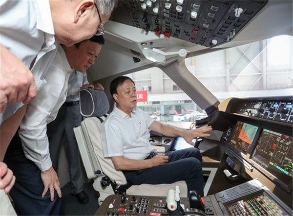 武维华在C919飞机模拟舱内询问国产大飞机的相关情况