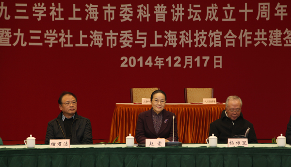 12月17日,九三学社市委举行科普讲坛成立十周年座谈会暨九三学社上海市委与科技馆合作共建签约仪式。九三学社中央副主席、上海市副市长、社市委主委赵雯出席并讲话。上海科技馆党委书记王莲华到会致辞。社市委原副主委、科普讲坛顾问团顾问杨雄里院士,社市委原副主委、社中央科普工作委员会主任褚君浩院士,市科协副主席李虹鸣出席会议并讲话。社内两院院士沈允钢、阮雪榆、雷啸霖、张永莲、王恩多,上海科技馆馆长王小明,社市委副主委周锋、钱锋,社市委科普讲坛顾问团、报告团和科普教育基地的代表等百余人出席座谈会,社市委秘书长朱红主持会议。